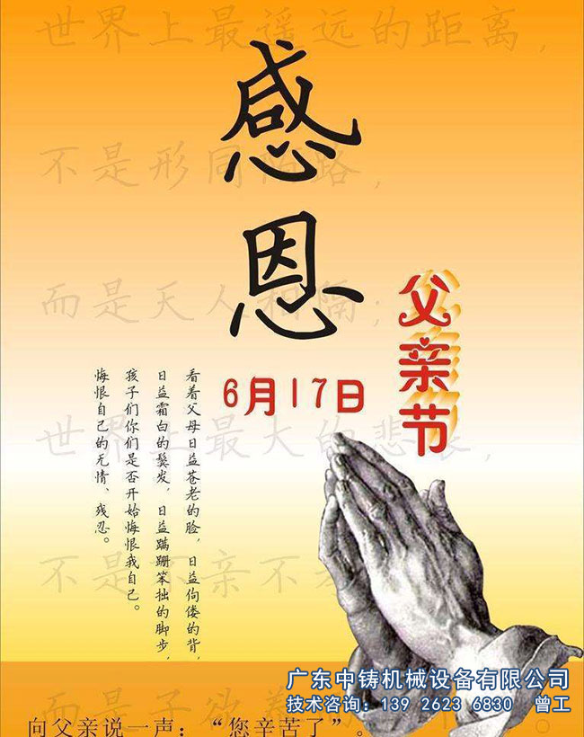 陪伴是更好的感恩!孝順,一輩子都還不完 !廣東中鑄機(jī)械設(shè)備有限公司的全體員工祝愿天下父母身體健康、壽比南山、節(jié)日快樂(lè)!