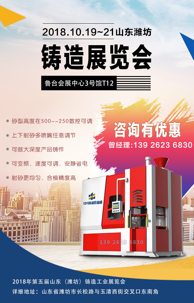 廣東中鑄機(jī)械設(shè)備有限公司是一家專業(yè)全自動(dòng)造型機(jī)、水平造型機(jī)、全自動(dòng)造型機(jī)生產(chǎn)廠家,將參加2018第五屆山東(濰坊)鑄造工業(yè)展覽會(huì)特邀新老鑄造朋友前來(lái)參加,現(xiàn)場(chǎng)簽約找我有特大優(yōu)惠接哦!以下是本次展會(huì)的詳細(xì)信息: